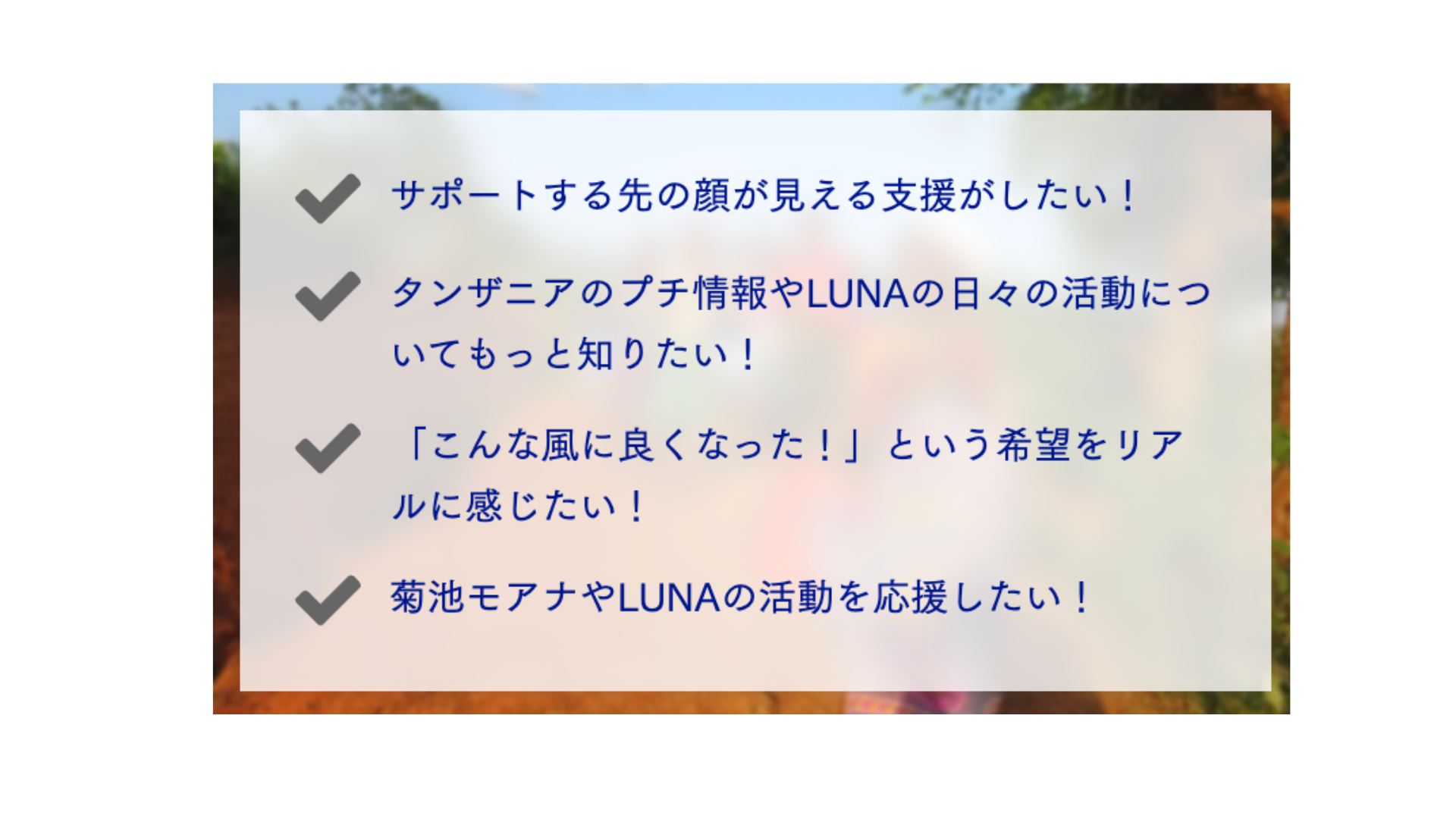 LUNAサポーターについてお読みいただきありがとうございます。代表の菊池モアナです。私自身もシングルマザーを経験したことで、彼女たちの痛みを身をもって体験することになったのですが、私には周りのサポートがいつもありました。そのようなサポートが得られないタンザニアの女の子たちを今度は私が応援したいと思っています。